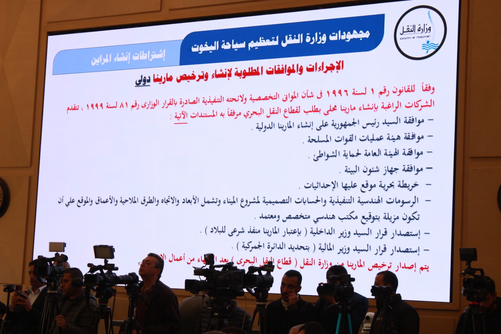 أوضح الفريق كامل الوزير وزير النقل، الإجراءات والموافقات المطلوبة لإنشاء وترخيص مرينا دولي وفقًا للقانون رقم١ لسنة ١٩٩٦ والقرار الوزاري رقم ٨١ لسنة ١٩٩٩ كالآتي: