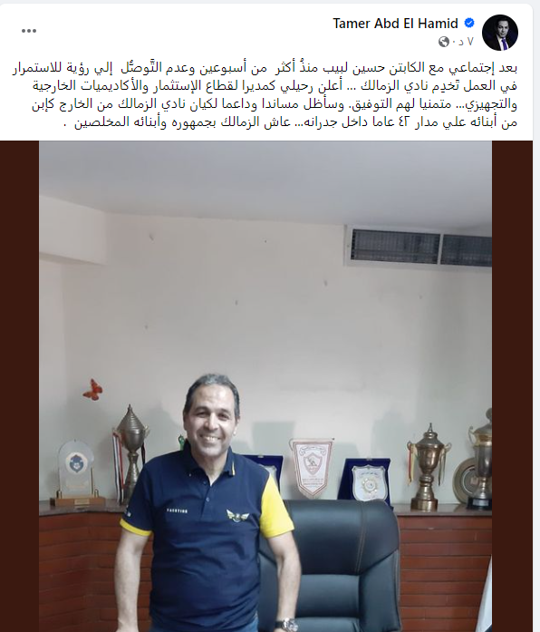 ونشر تامر عبد الحميد صوره له عبر حسابه الشخصي على موقع التواصل الاجتماعي فيس بوك وعلق عليها قائلا" :" بعد إجتماعي مع الكابتن حسين لبيب منذُ أكثر من أسبوعين وعدم التَّوصُّل إلي رؤية للاستمرار في العمل تَخدِم نادي الزمالك أعلن رحيلي كمديرا لقطاع الاستثمار والأكاديميات الخارجية والتجهيزي متمنيا لهم التوفيق".