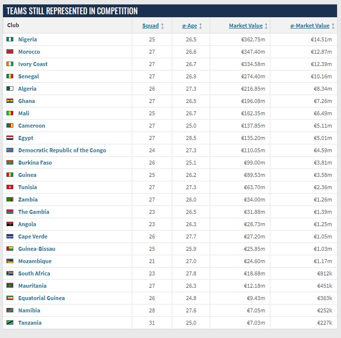 ترتيب أغلى منتخبات أمم أفريقيا من حيث القيمة التسويقية