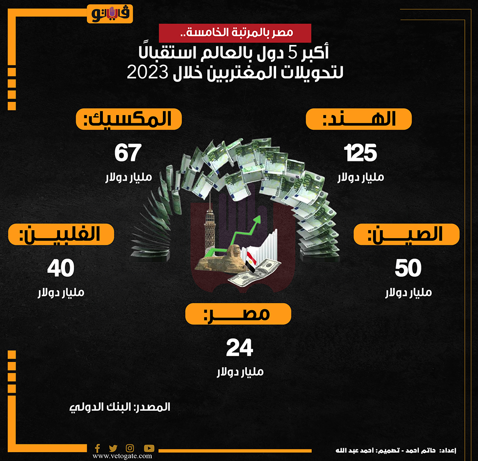 مصر بالمرتبة الخامسة.. أكبر 5 دول بالعالم استقبالًا لتحويلات المغتربين خلال 2023 (إنفوجراف) الأربعاء 03/يناير/2024 - 10:34 م 1/3/2024 10:34:54 PM تحويلات المواطنين في الخارج، فيتو حاتم أحمد شارك طباعة 18 حجم الخط شارك طباعة تحويلات المصـريين تحويلات المصـريين العاملين بالخارج البنك الدولي