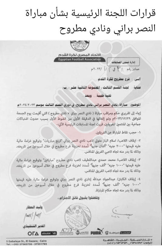 وأرسل اتحاد الكرة خطابا إلى فرع مطروح لكرة القدم، يتضمن قرارات لجنة المسابقات بشأن مباراة النصر براني ونادي مطروح والتي أقيمت يوم الجمعة الماضي وتم إلغاؤها في الدقيقة الأولى بسبب حدوث اشتباكات جماعية بين لاعبي الفريقين.