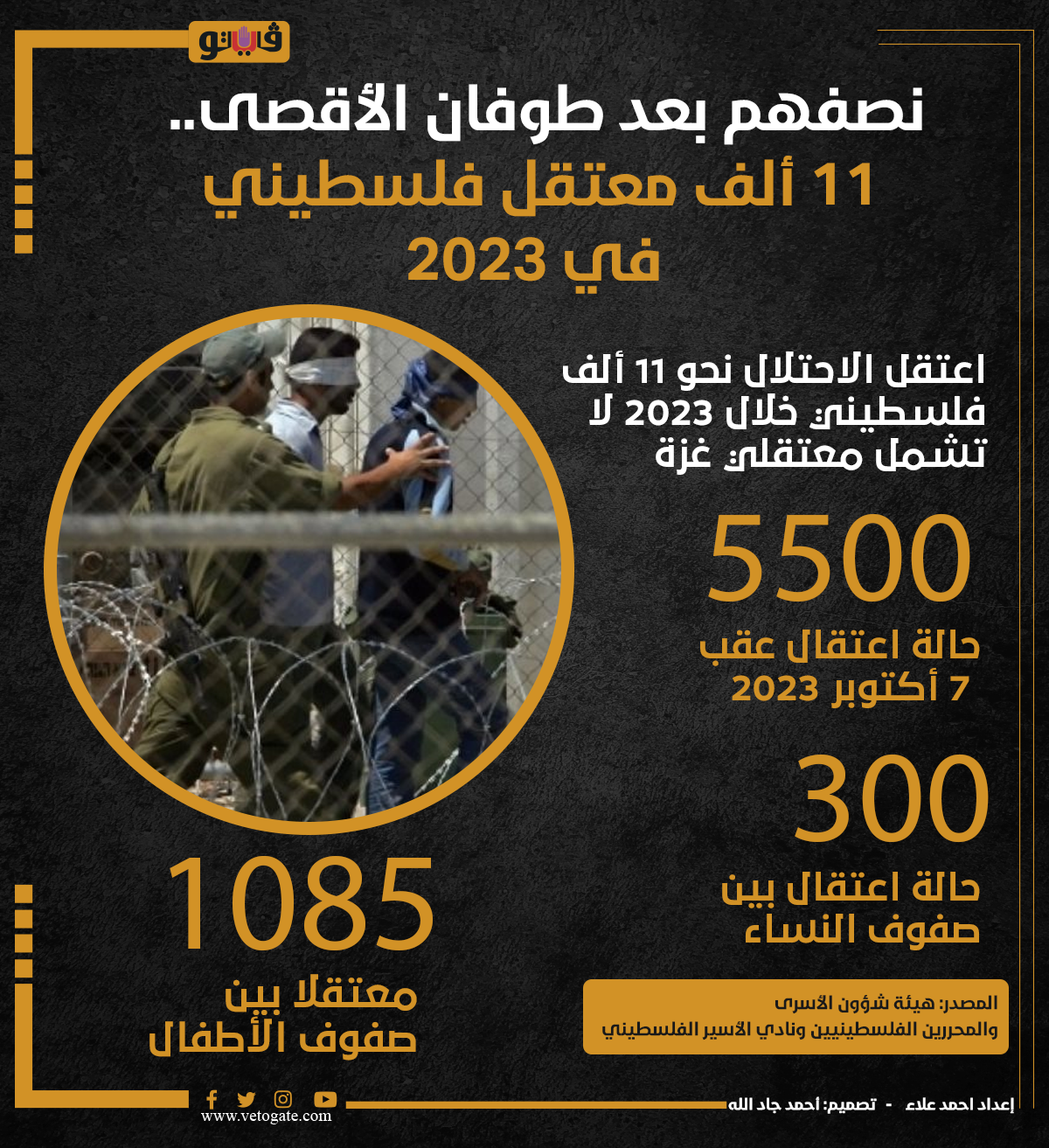 نصفهم بعد طوفان الأقصى.. 11 ألف معتقل فلسطيني في 2023 (انفوجراف) الثلاثاء 09/يناير/2024 - 11:04 ص 1/9/2024 11:04:15 AM سجون الاحتلال، فيتو احمد علاء شارك طباعة 18 حجم الخط شارك طباعة طوفان الأقصى قوات الاحتلال غزة هيئة شؤون الأسرى والمحررين الفلسطينيين نادي الاسير الفلسطيني جيش الاحتلال سجون الاحتلال