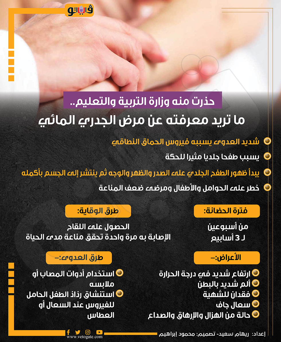 حذرت منه وزارة التربية والتعليم.. ما تريد معرفته عن مرض الجدري المائي (إنفوجراف) السبت 06/يناير/2024 - 06:19 م 1/6/2024 6:19:00 PM الجدري المائي،فيتو ريهام سعيد شارك طباعة 18 حجم الخط شارك طباعة الطفح الجلدي الجدري المائي الجديري المائي الجديري مرض الجديري المائي مرض الجديري وزارة التربية والتعليم وزارة التربية