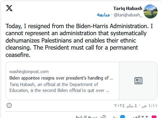 وقال المستشار بوزارة التعليم الأمريكية طارق حبش، في خطاب الاستقالة الذي نشرته شبكة "إن بي سي نيوز": "لا استطيع مواصلة التزام الصمت بينما تغض هذه الإدارة الطرف عن الفظائع التي ترتكب ضد الفلسطينيين الأبرياء خلال حملة الإبادة الجماعية التي تشنها الحكومة الإسرائيلية بحسب وصف خبراء بارزين في مجال حقوق الإنسان.. ولهذا يتعين علي أن استقيل".