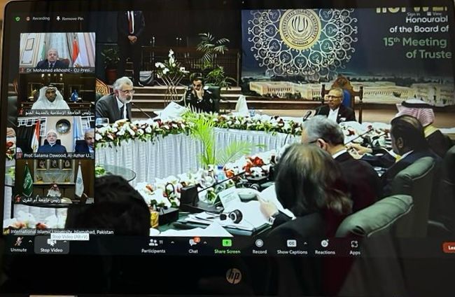 وناقش الاجتماع بحضور الرئيس الباكستاني، وبمشاركة عدد من العلماء البارزين أعضاء مجلس أمناء الجامعة الإسلامية العالمية، من بينهم الدكتور محمد الخشت، تقريرًا حول أداء الجامعة وأنشطتها التعليمية والبحثية.