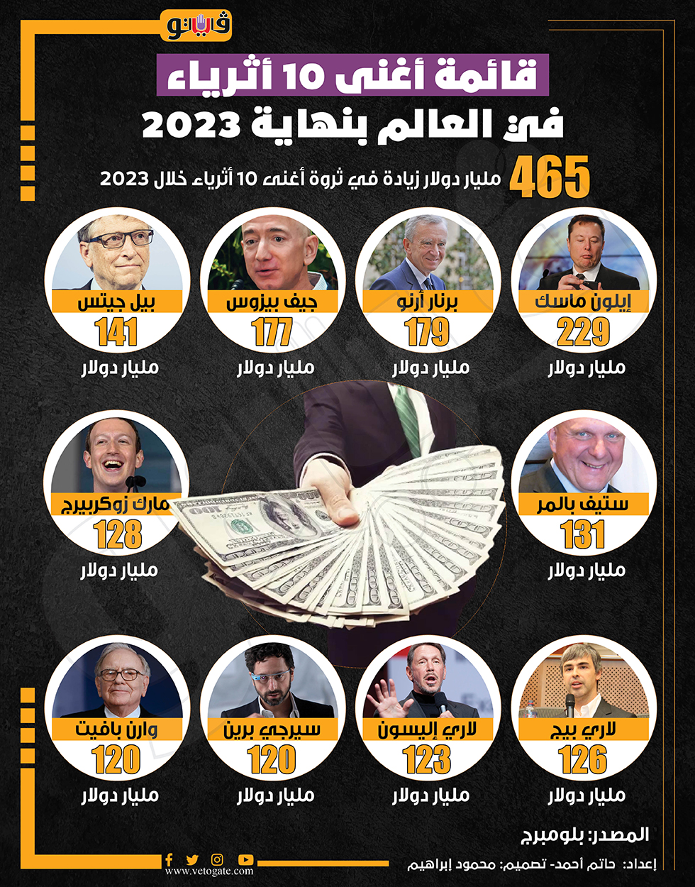 قائمة أغنى 10 أثرياء في العالم بنهاية 2023 (إنفوجراف) الخميس 04/يناير/2024 - 03:36 م 1/4/2024 3:36:03 PM أثرياء العالم، فيتو حاتم أحمد شارك طباعة 18 حجم الخط شارك طباعة أثرياء العالم أثرى 10 أغنياء إيلون ماسك ثروة أغنى 10 أثرياء خلال 2023 جيف بيزوس مارك زوكربيرج