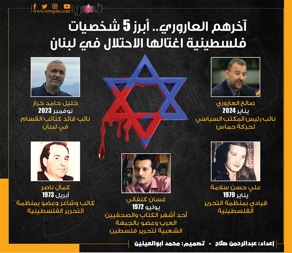 آخرهم العاروري.. أبرز 5 شخصيات فلسطينية اغتالها الاحتلال في لبنان (إنفوجراف) الجمعة 05/يناير/2024 - 07:00 م 1/5/2024 7:00:11 PM اغتيالات الاحتلال في لبنان، فيتو عبدالرحمن صلاح شارك طباعة 18 حجم الخط شارك طباعة العاروري اغتيال العاروري طوفان الأقصى صالح العاروري غسان كنفاني غزة