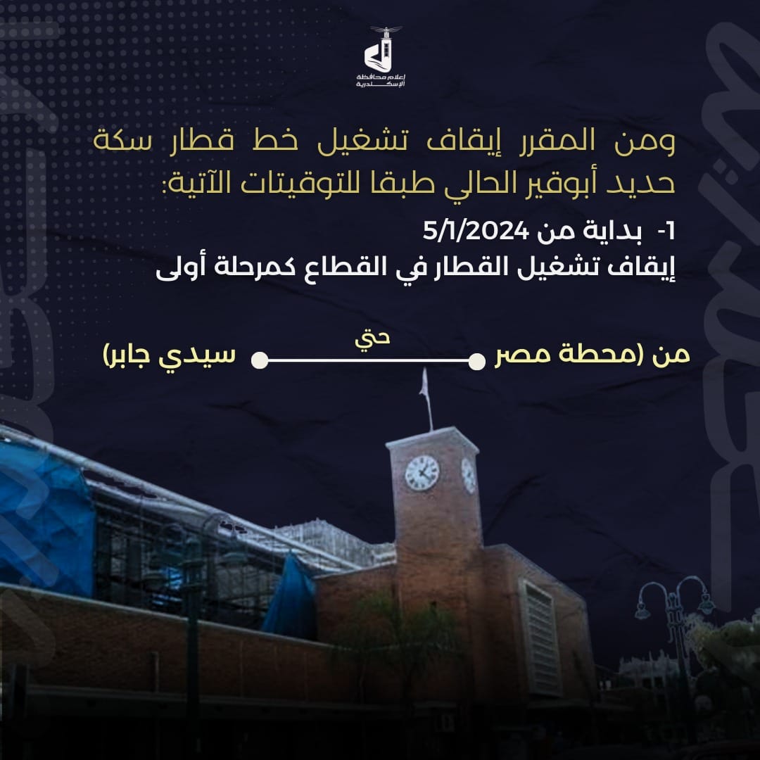 محافظة الإسكندرية نشرت عبر صفحتها الرسمية على موقع التواصل الاجتماعي فيسبوك مراحل إيقاف خط السكة الحديد أبو قير بناء على الجدول الزمني الذي حددته وزارة النقل.