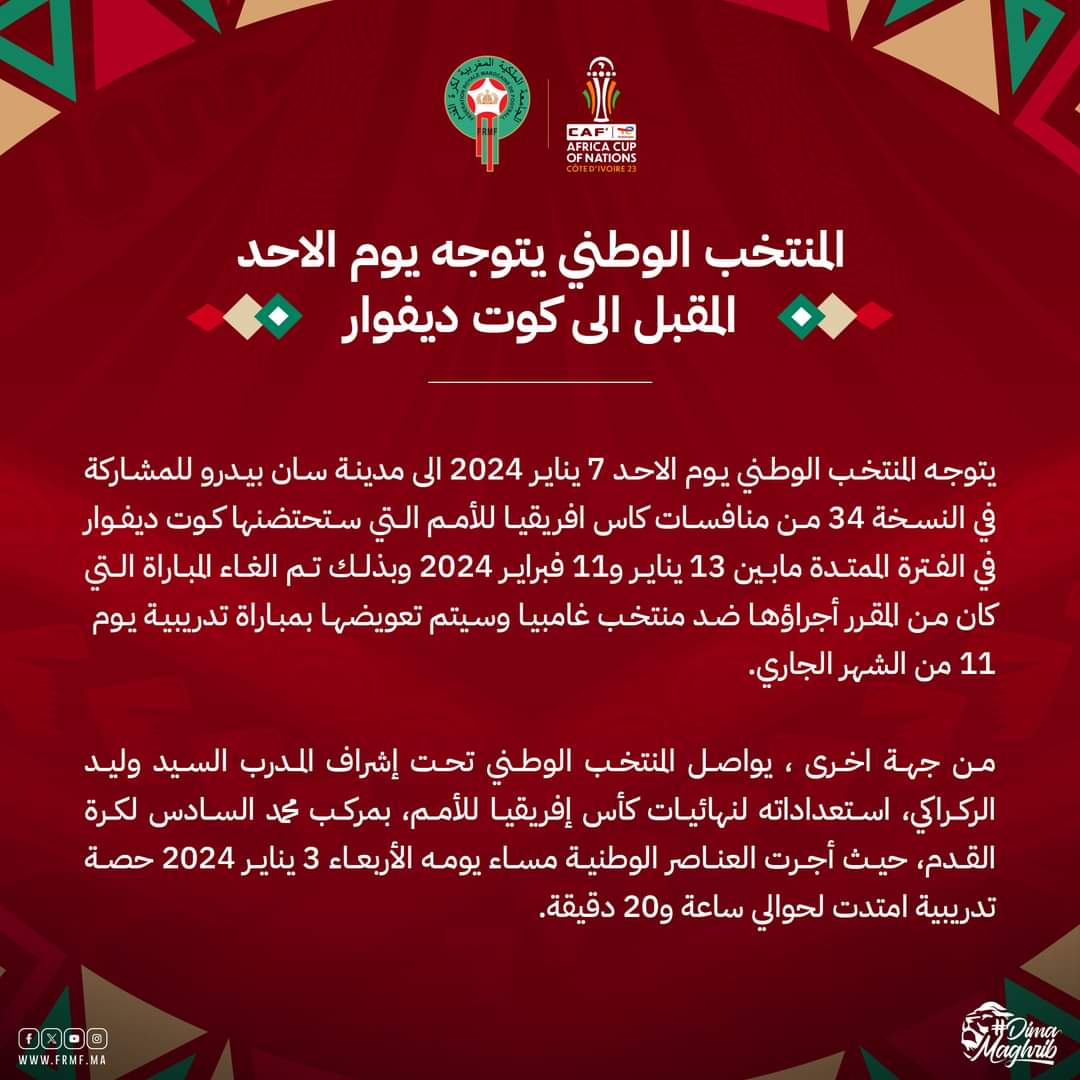 كأس أمم أفريقيا 2023، قرر الاتحاد المغربي لكرة القدم إلغاء ودية جامبيا مع منتخب المغرب والتي كان من المقرر إقامتها الأحد المقبل علي أن يسافر الفريق إلى كوت ديفوار في نفس اليوم استعدادا لخوض أمم أفريقيا 2023 في المقرر إقامتها خلال الفترة من 13 يناير حتى 11 فبراير المقبل.