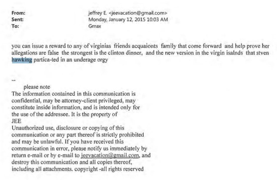 الغريبة أن ملفات جيفري إبستين تقول إن ستيفن هوكينغ شارك في طقوس العربدة مع قاصرات، في حفل يشمل الإفراط في شرب الخمر والنشاط الجنسي غير المقيد!