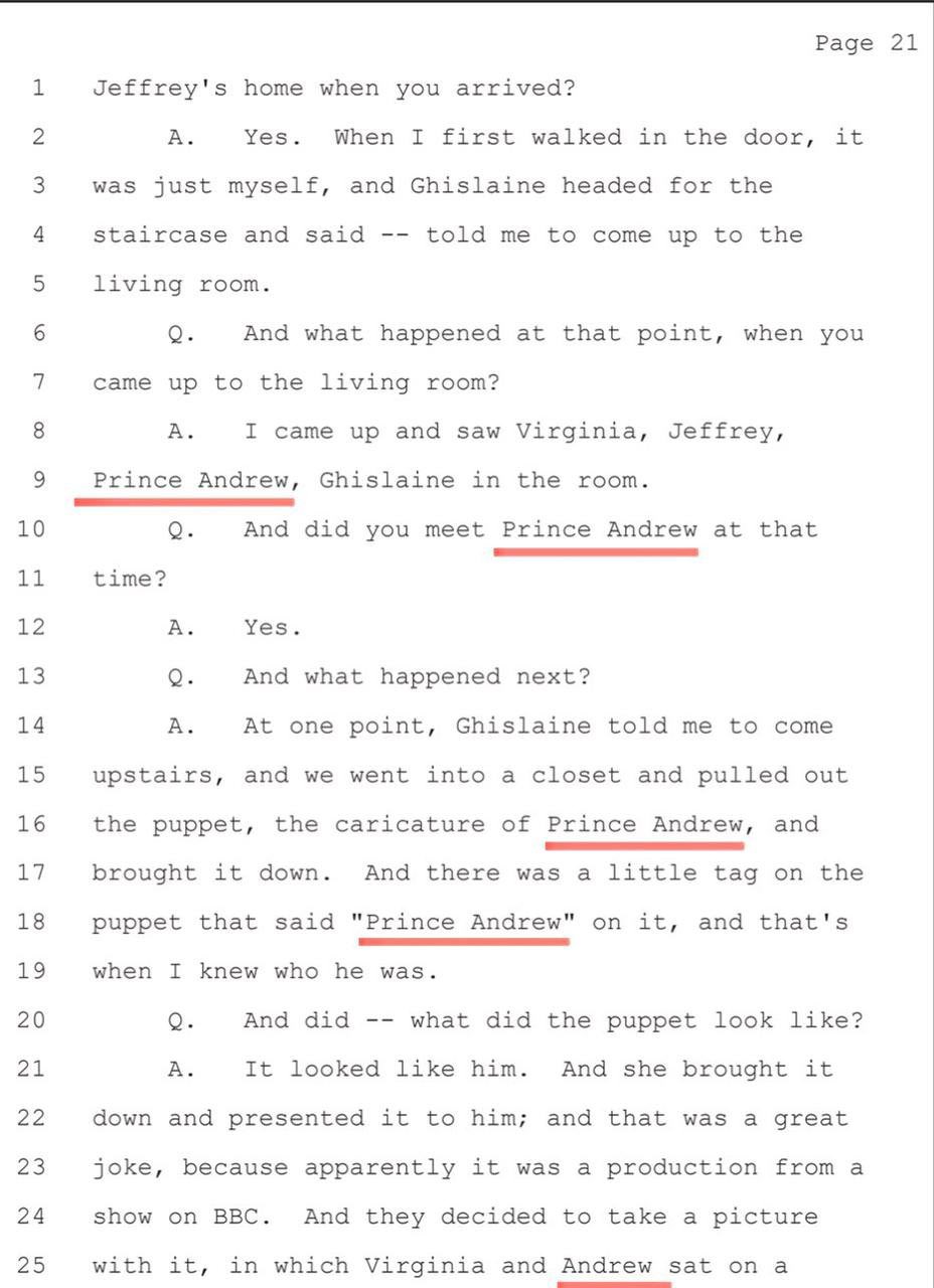 أحد القاصرات ورمز اسمها بـ جون دو 3، تشفير حتى لا تُكشف هويتها، ذكرت أن جيفري ابستين أجبرها على أن تقوم بأعمال شائنة مع ثلاث اشخاص بارزين هم (الأمير اندرو، وجان لوك برونيل، وآلان ديرشويتز، محامي ودكتور بجامعه هارفارد".