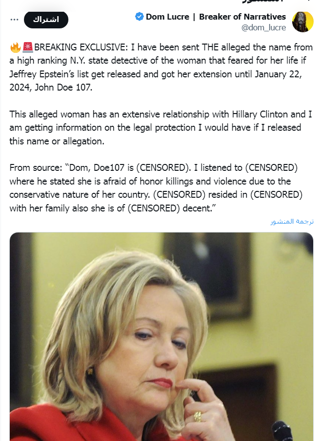 وتتمته جون دو 107، هذه المرأة المزعومة بعلاقة واسعة النطاق مع هيلاري كلينتون، وحصلت على الحماية القانونية، حتي يتم رفع هذه الحماية عن اسمها، حيث ذكرت المرأة المزعومة أنها خاضعة للرقابة، وتخشى جرائم الشرف والعنف بسبب الطبيعة المحافظة لبلدها. وقيم هذه السيدة في (CENSORED) مع عائلتها وهي أيضًا من (CENSORED).