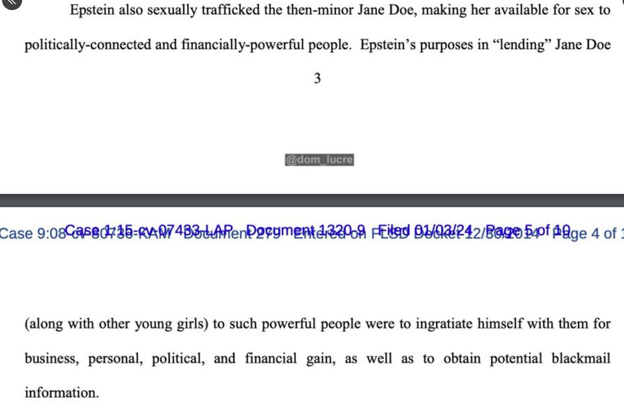 وتم الكشف عن أول الوثائق في قضية فضائح جيفري إبستاين، وهي عبارة عن 1000 صفحة تقريبًا، والملف يحمل معلومات مهمة، ومن الممكن أن يكون بها شخصيات كبيرة، من المحتمل تورطهم في قضية البيدوفيليا واستغلال الأطفال أو الاتجار بهم، وبعض الأسماء تم ذكرها لكنها لم ترد ضمن لائحة المتهمين.