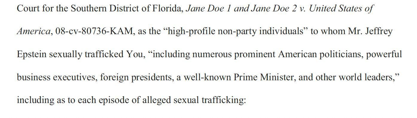 وجاء في ملفات قضية جيفري أبستين أمر محير، ويعتبره البعض من الأمور الأكثر غرابة، وهو أسم ورئيس وزراء متورط في قضية إبستين، حيث ذكرت الوثائق "رئيس وزراء معروف"، كان جيفري ابستين يهرب له الفتيات القاصرات!، لم تكشف الوثائق اسم رئيس الوزراء.