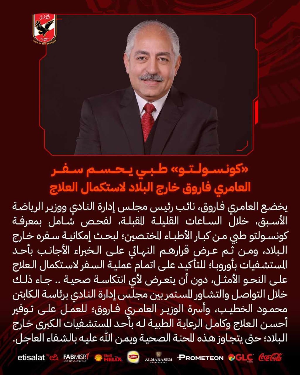 وجاء ذلك بعد قرار من محمود الخطيب رئيس مجلس إدارة النادي الأهلي وأسرة العامري فاروق للعمل على توفير كافة الرعاية الطبية له خلال الفترة المقبلة.