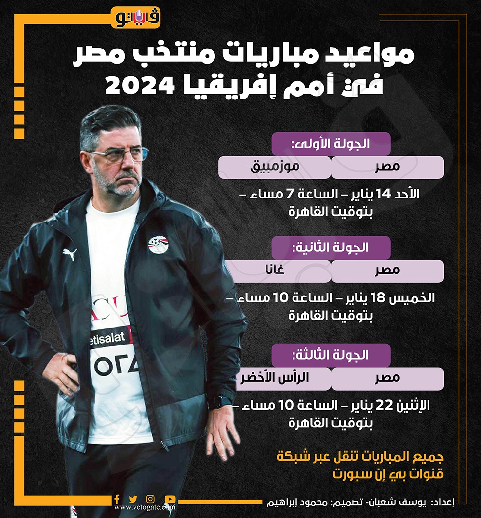 مواعيد مباريات منتخب مصر في أمم إفريقيا 2024 (إنفوجراف) السبت 06/يناير/2024 - 06:06 م 1/6/2024 6:06:13 PM مواعيد مباريات منتخب مصر في أمم أفريقيا للكبار، فيتو يوسف شعبان شارك طباعة 18 حجم الخط شارك طباعة منتخب مصر أخبار منتخب مصر الأول لكرة القدم أمم إفريقيا بطولة أمم أفريقيا مواعيد منتخب مصر بأمم أفريقيا 2024 كأس الأمم الأفريقية 2024 أخبار بطولة أمم أفريقيا 2024