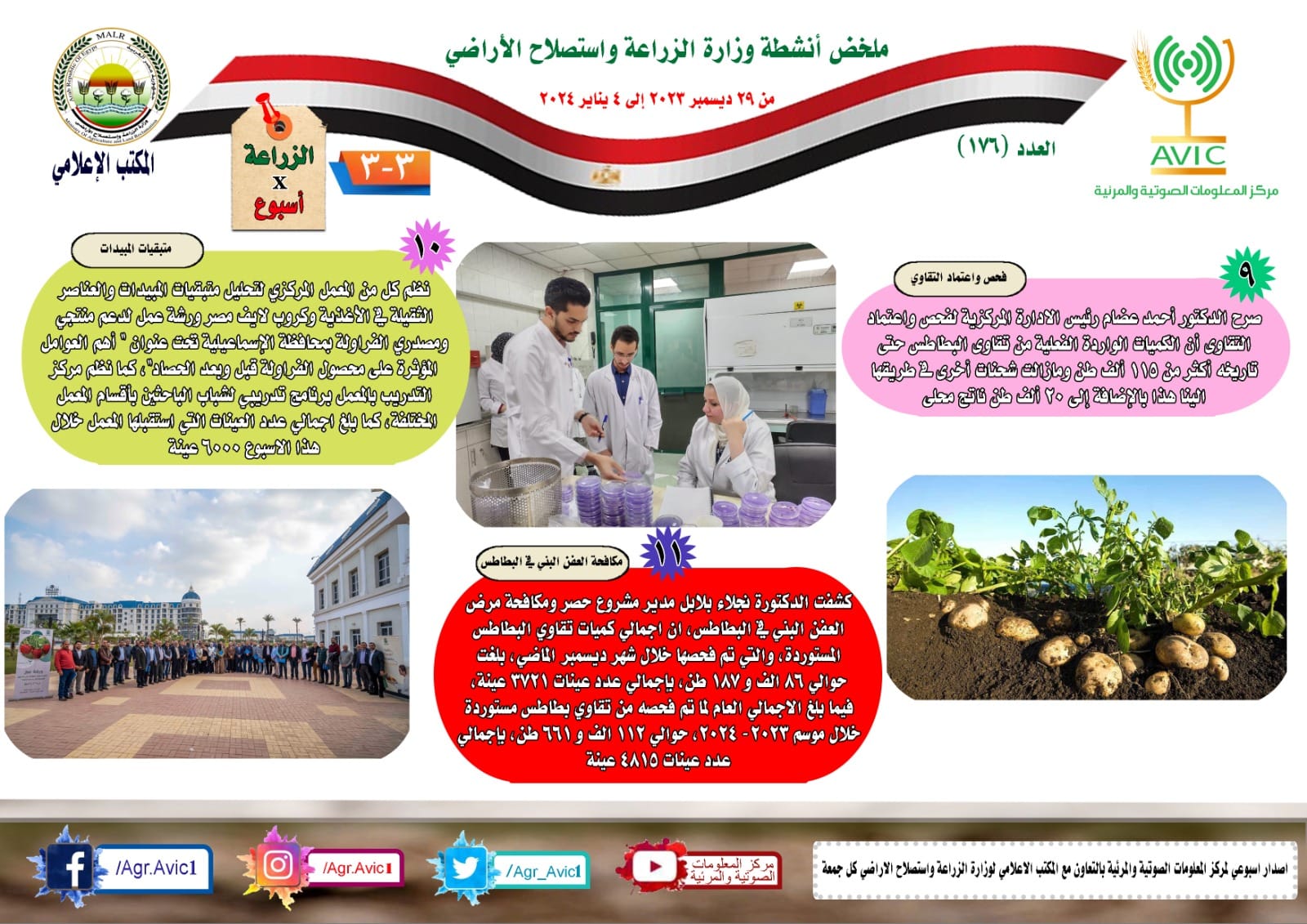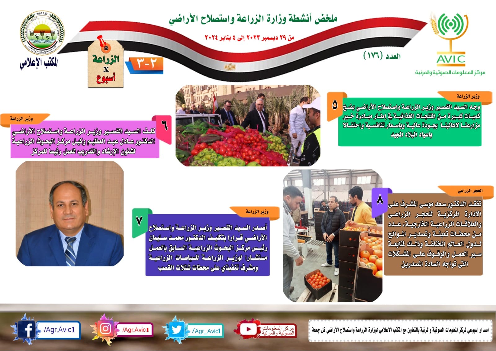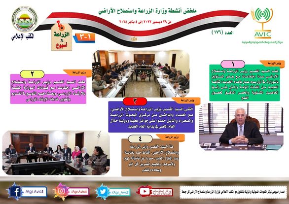 أصدر مركز المعلومات الصوتية والمرئية، التابع لـ وزارة الزراعة واستصلاح الأراضي، "الإنفوجراف الأسبوعي" في نسخته رقم ١٧٦، حول الحصاد الأسبوعي لأهم أنشطة الوزارة، خلال الأسبوع الماضي في الفترة ٢٩ ديسمبر وحتى ٤ يناير الجاري، وذلك بالتعاون مع المكتب الإعلامي للوزارة، كما أصدر المركز أيضا ملخصا بالفيديو، حول أنشطة الوزارة خلال نفس الفترة.