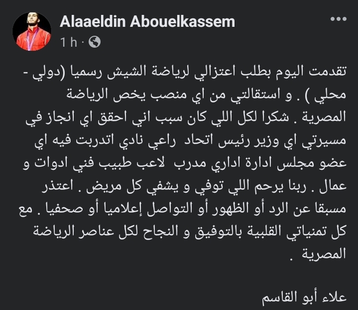 وقال أبو القاسم من خلال صفحته الرسمية “تقدمت اليوم بطلب اعتزالي لرياضة الشيش رسميا (دولي - محلي ). واستقالتي من أي منصب يخص الرياضة المصرية”.