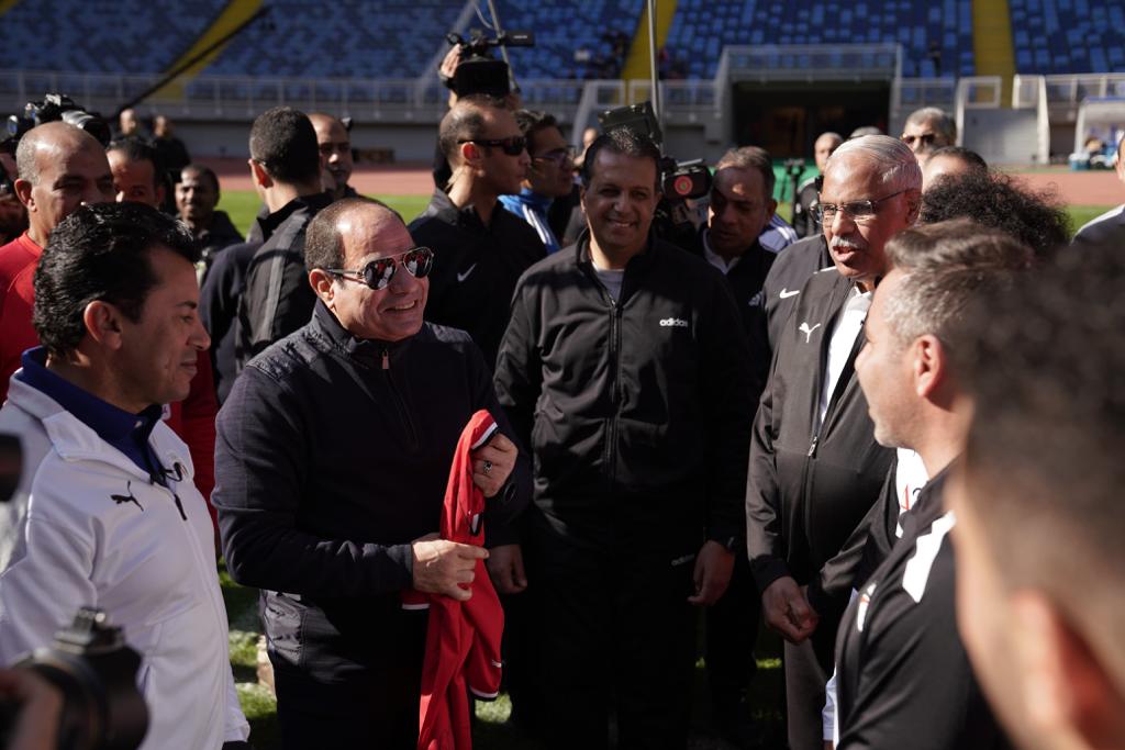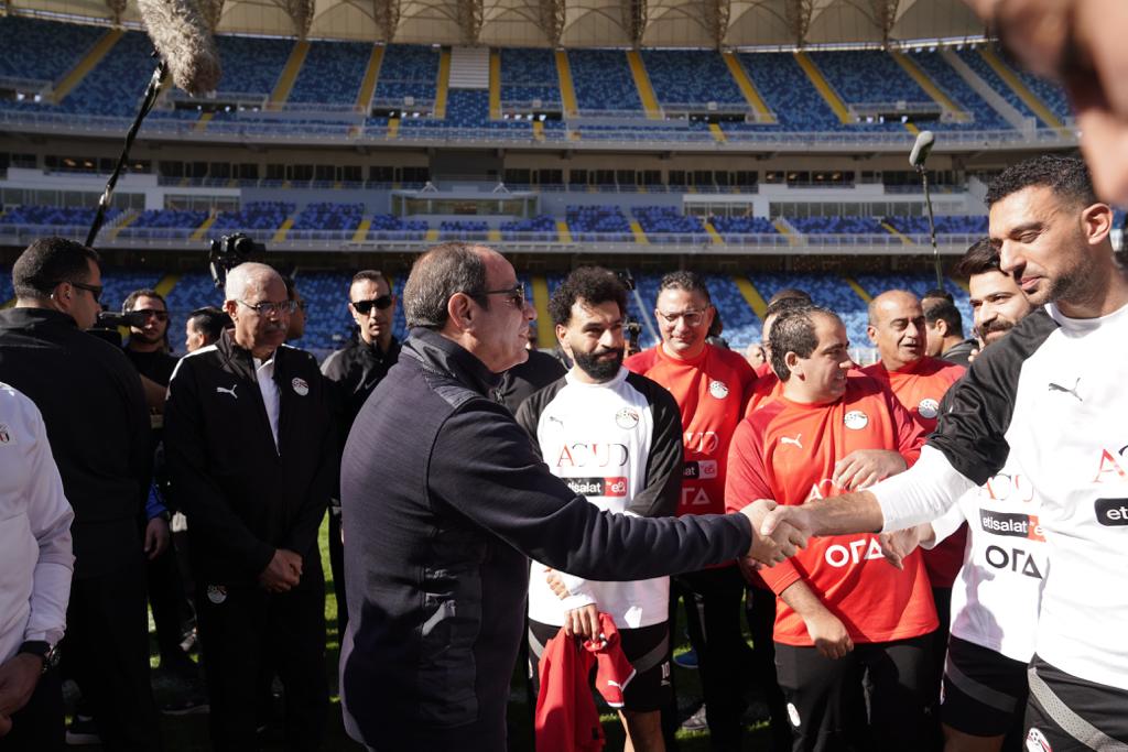 كما تفقد الرئيس السيسي تدريبات المنتخب الوطني لكرة القدم وصافح الرئيس اللاعبين وعلى رأسهم محمد صلاح والنني كما التقط لاعبي المنتخب الصور التذكاية مع السيسي.