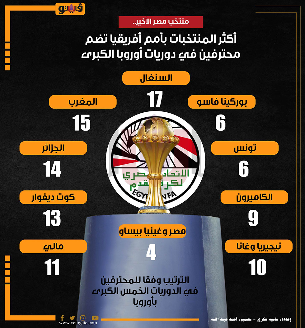 منتخب مصر الأخير.. أكثر المنتخبات بأمم أفريقيا تضم محترفين في دوريات أوروبا الكبرى (إنفوجراف) الأحد 07/يناير/2024 - 11:20 ص 1/7/2024 11:20:26 AM سامية شكري شارك طباعة 18 حجم الخط شارك طباعة كأس أمم أفريقيا الدوريات الخمسة الكبرى المنتخبات الأفريقية