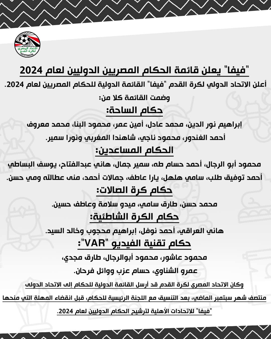 وأعلن الاتحاد الدولي لكرة القدم "فيفا" القائمة الدولية للحكام المصريين لعام 2024.