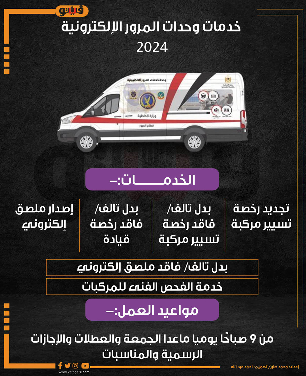 خدمات وحدات المرور الإلكترونية 2024 (إنفوجراف) الأربعاء 10/يناير/2024 - 07:39 م 1/10/2024 7:39:58 PM خدمات وحدات المرور الإلكترونية 2024 ومواعيدها محمد صابر شارك طباعة 18 حجم الخط شارك طباعة وحدات المرور وحدات المرور الالكترونية خدمات وحدات المرور الالكترونية إصدار ملصق إلكتروني مواعيد العمل وحدات المرور
