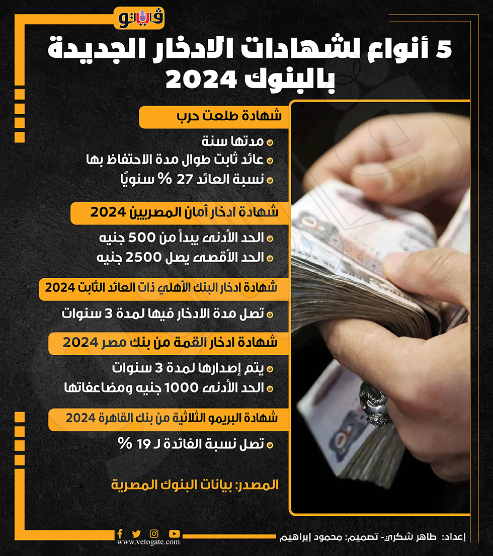5 أنواع لشهادات الادخار الجديدة بالبنوك 2024 (انفوجراف) الإثنين 08/يناير/2024 - 06:39 م 1/8/2024 6:39:32 PM الجنيه المصرى، فيتو طاهر شكري شارك طباعة 18 حجم الخط شارك طباعة شهادة طلعت حرب شهادة ادخار أمان المصريين 2024 شهادة ادخار البنك الأهلي ذات العائد الثابت 2024 شهادة ادخار شهادة ادخار القمة من بنك مصر 2024 شهادة البريمو الثلاثية من بنك القاهرة 2024 بنك القاهرة بنك مصر البنك الاهلي أمان المصريين