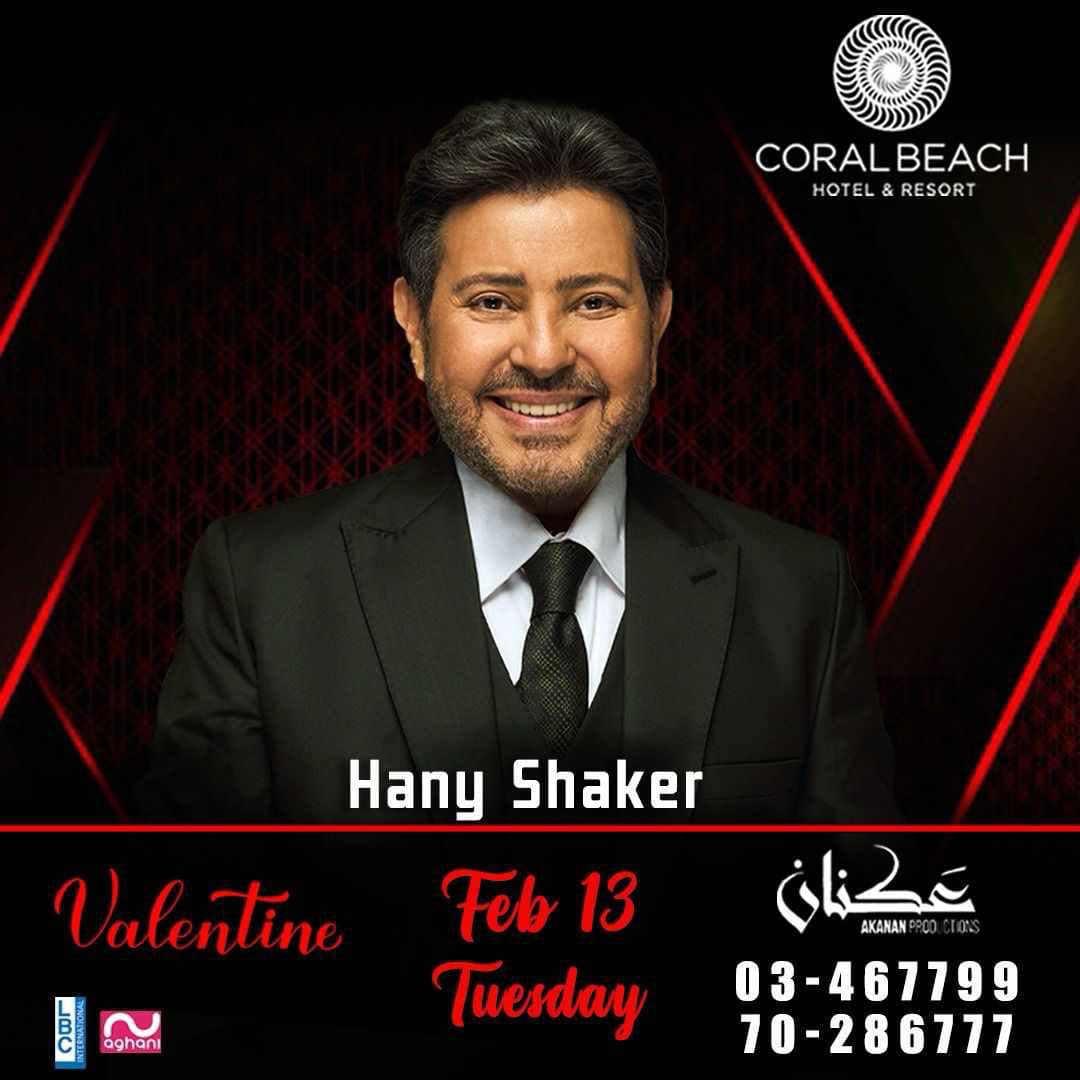 ويحيي هاني شاكر حفل عيد الحب يوم 13 فبراير في لبنان، ومن المقرر أن يقدم عددا من أجمل أغنياته الكلاسيكية والجديدة والتي تتناسب مع تلك المناسبة كــ: انتي لسه بتسألي، بحبك أنا، مش حب وبس، معاك وحب كبير.