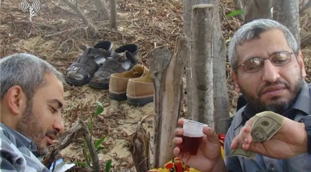 وظهر الضيف المطلوب الأول لإسرائيل في الصورة التي نشرتها إسرائيل ينظر في ساعة وبيده دولارات ومتكئا على الأرض وبجواره شخص غير معروف.