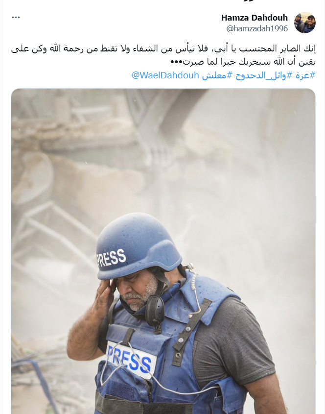 وكتب حمزة وائل الدحدوح في آخر رسالة وجهها لوالده، عبر حسابه على منصة "أكس"، وكأنه كان يشعر باقتراب أجله واختيار الله له للشهادة، فقال في رسالته لوالده: "إنك الصابر المحتسب يا أبي، فلا تيأس من الشفاء ولا تقنط من رحمة الله وكن على يقين أن الله سيجزيك خيرًا لما صبرت."