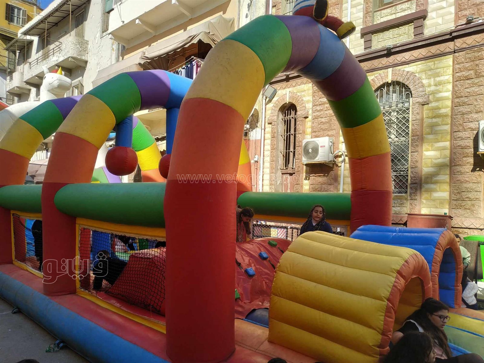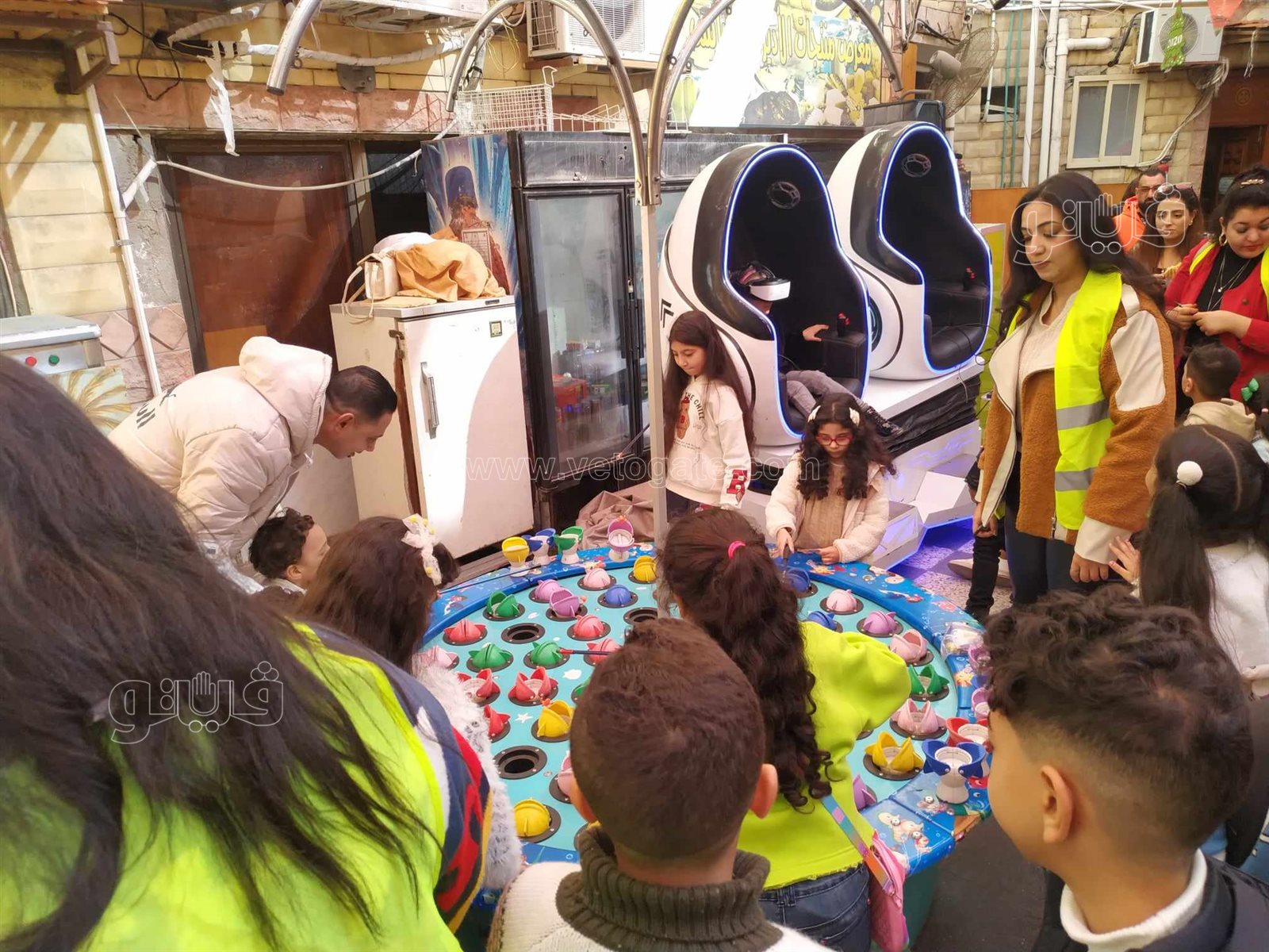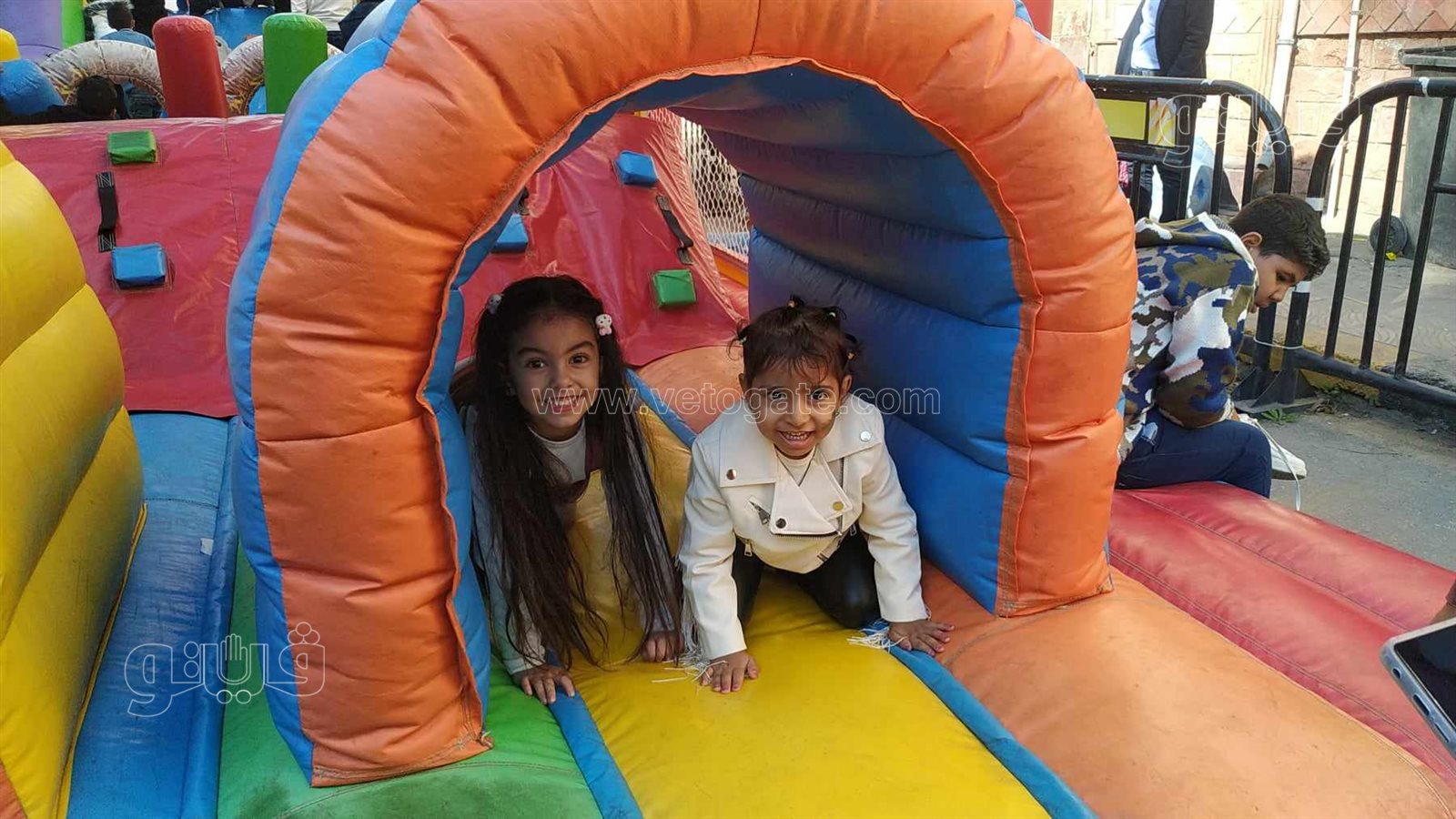 كما تم إلقاء شلالات بالونات بألوان مبهجة على الأطفال من أعلى وكان بداخلها حلوى وهدايا رمزية، والتي رسمت البهجة على وجوه الأطفال.
