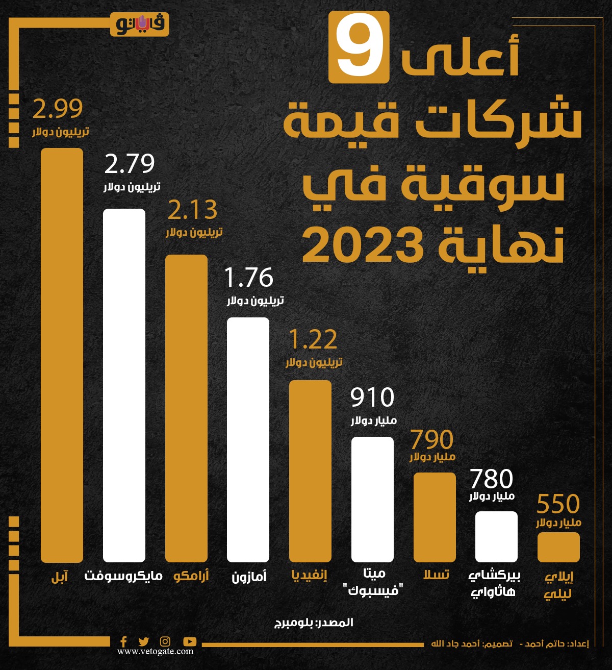 أعلى 9 شركات قيمة سوقية في نهاية 2023 (إنفوجراف) الثلاثاء 09/يناير/2024 - 06:00 م 1/9/2024 6:00:22 PM أعلى شركات قيمة سوقية، فيتو حاتم أحمد شارك طباعة 18 حجم الخط شارك طباعة ابل مايكروسوفت ارامكو بلومبرج امازون
