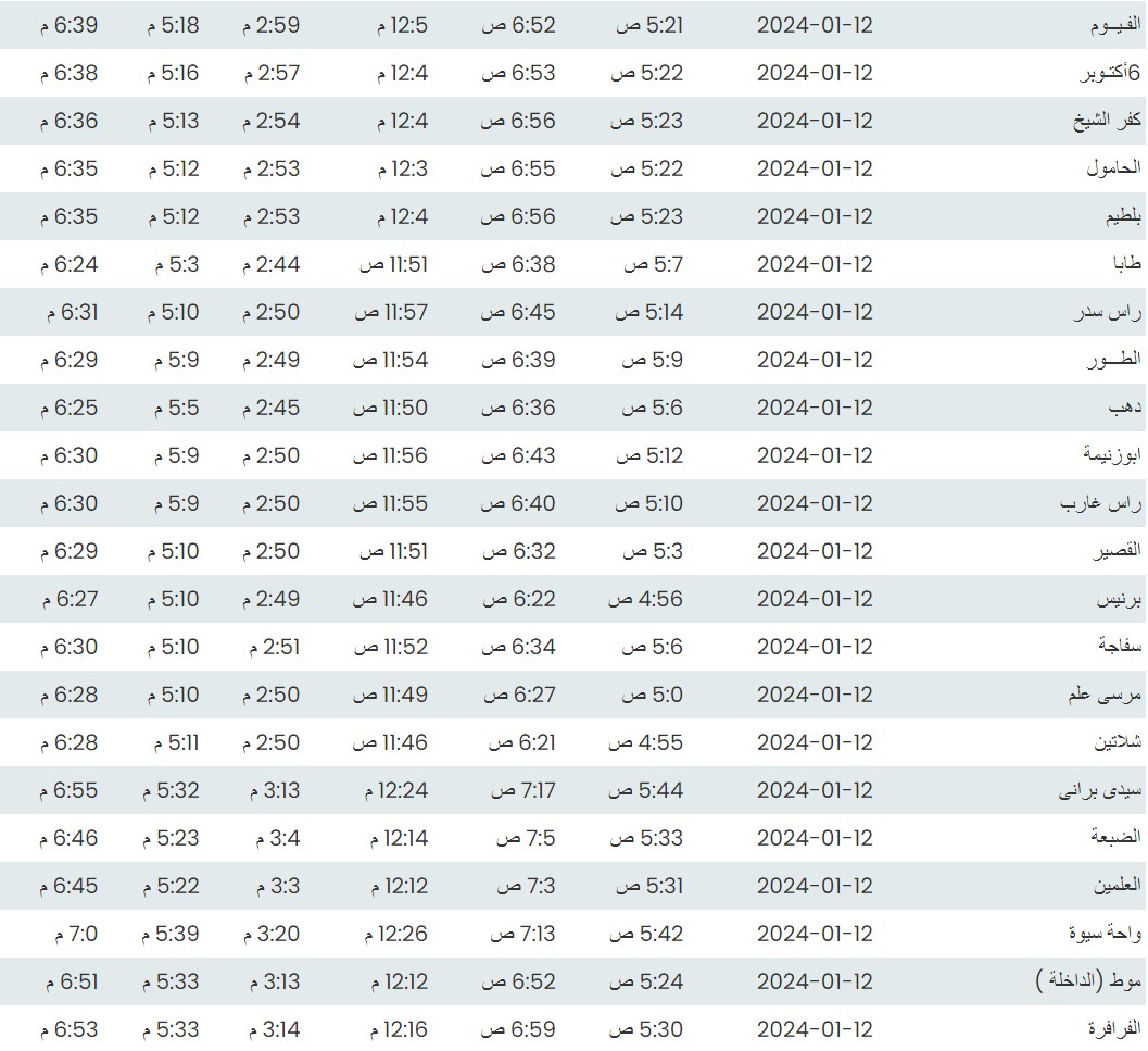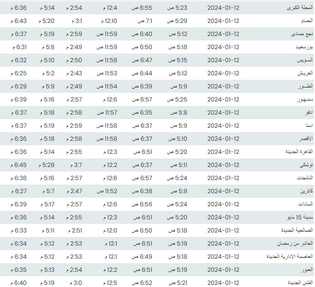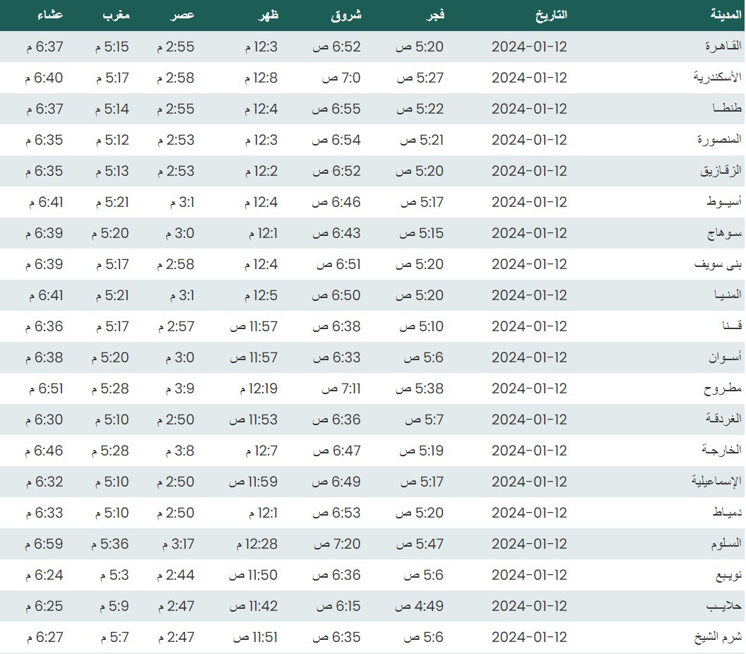 وفيما يلي مواقيت الصلاة، لعدد من مدن ومحافظات الجمهورية من واقع بيانات الهيئة العامة للمساحة