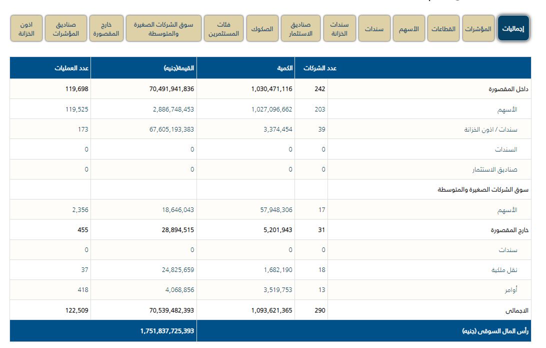 تباينت مؤشرات البورصة بختام تعاملات الأربعاء الماضي، وخسر رأس المال السوقي مليار جنيه ليغلق عند مستوى 1.752 تريليون جنيه.