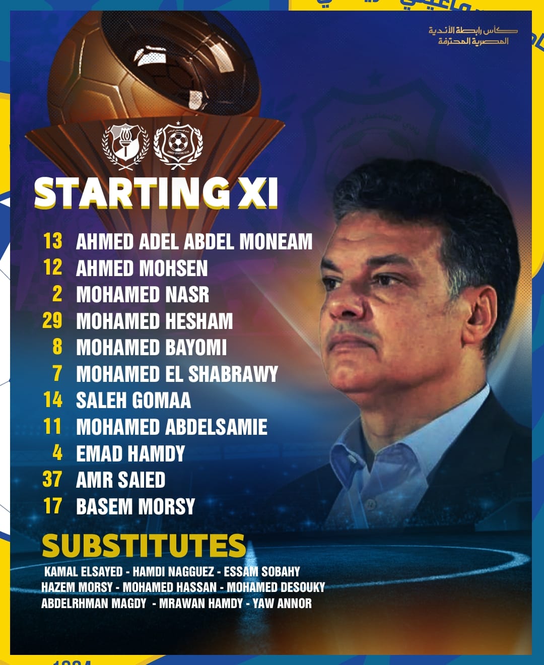 وقاد باسم مرسي تشكيل الإسماعيلي أمام الداخلية في كأس الرابطة وجاء التشكيل كالتالي