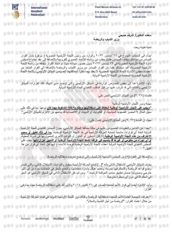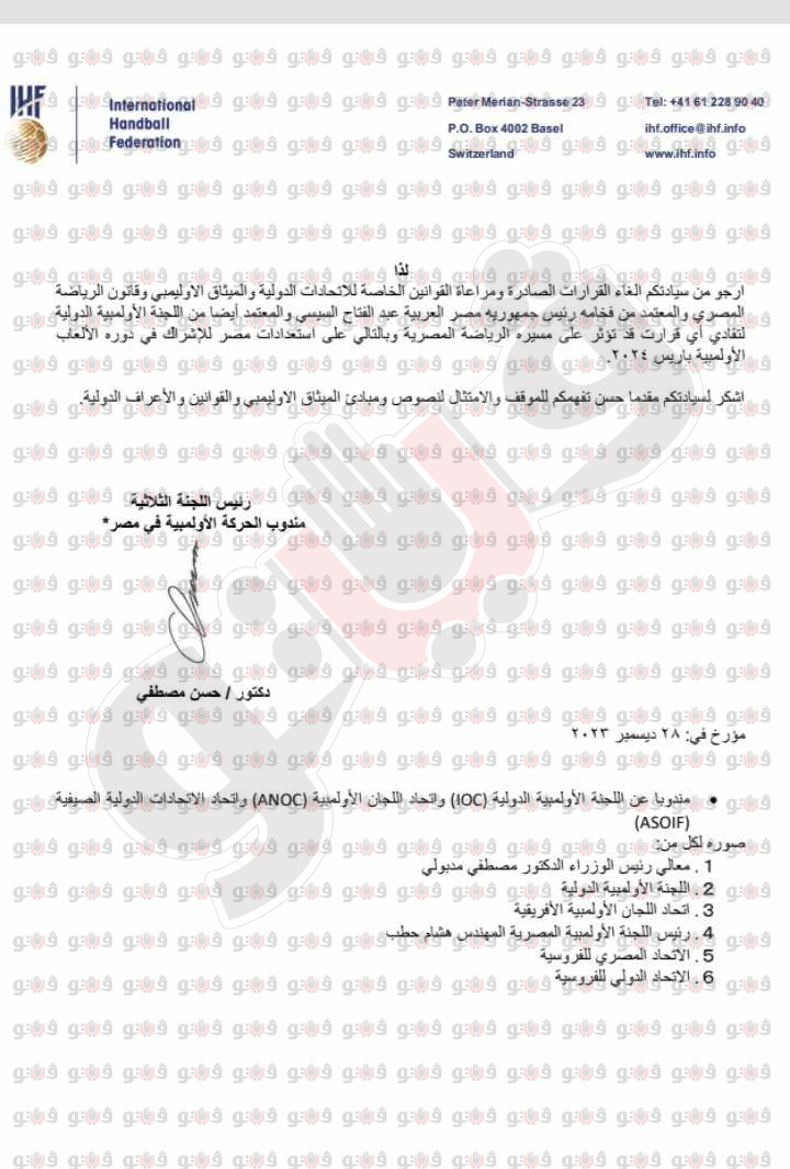وكان الدكتور حسن مصطفى رئيس الاتحاد الدولي لكرة اليد، وممثل اللجنة الأولمبية الدولية في مصر، خطابا رسميا إلى الدكتور أشرف صبحي، وزير الشباب والرياضة، يهدد خلاله باستبعاد مصر من دورة الألعاب الأولمبية باريس 2024، بسبب شبهة التدخل الحكومي، في قرار إيقاف هشام حطب رئيس اللجنة الأولمبية، وعقد اجتماع للأولمبية دون حضور حطب.