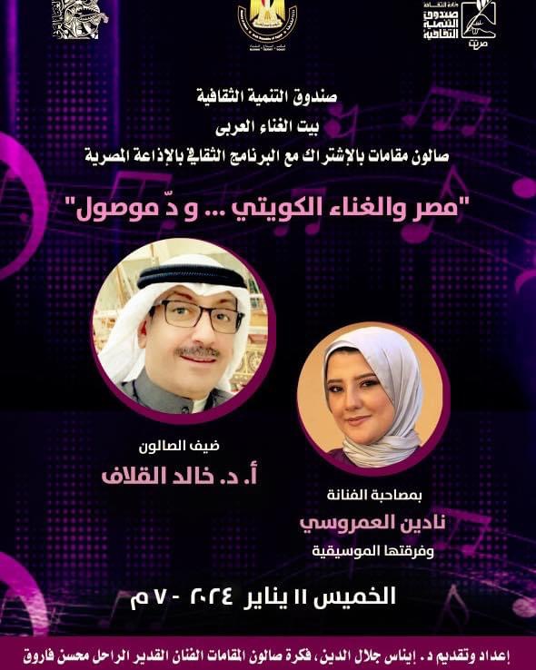 ويقام صالون هذا الشهر تحت عنوان "مصر والغناء الكويتي....ود موصول"، بالاشتراك مع البرنامج الثقافي بالإذاعة المصرية.
