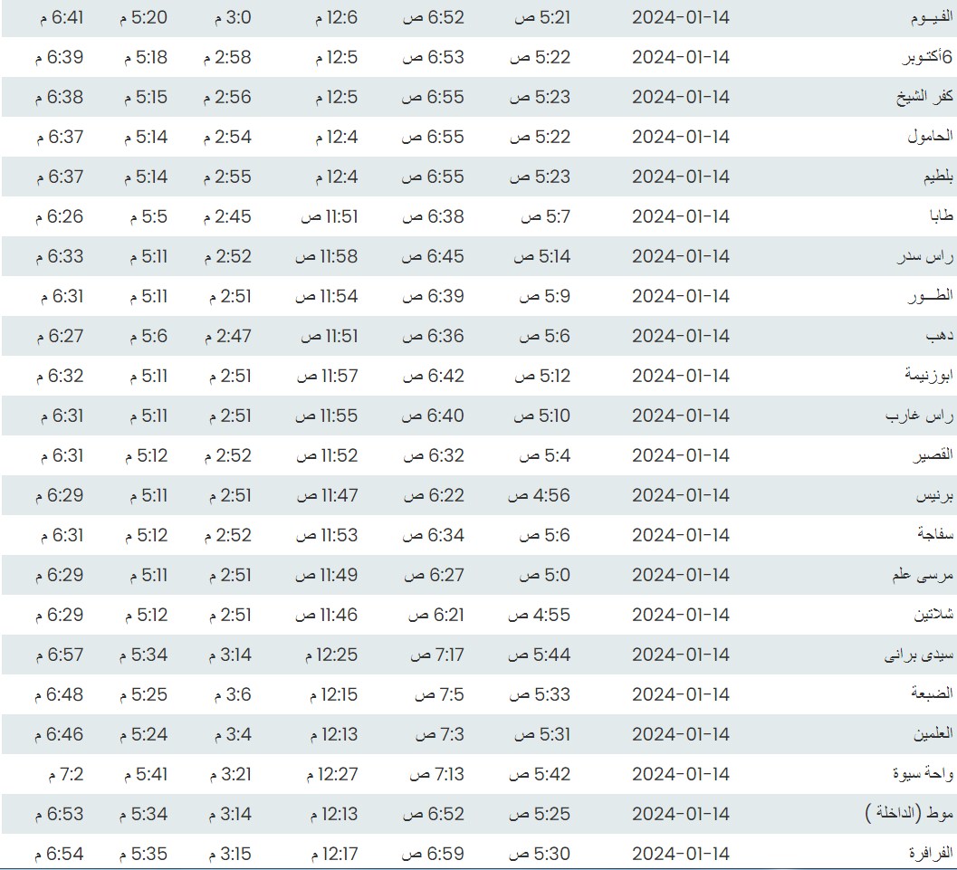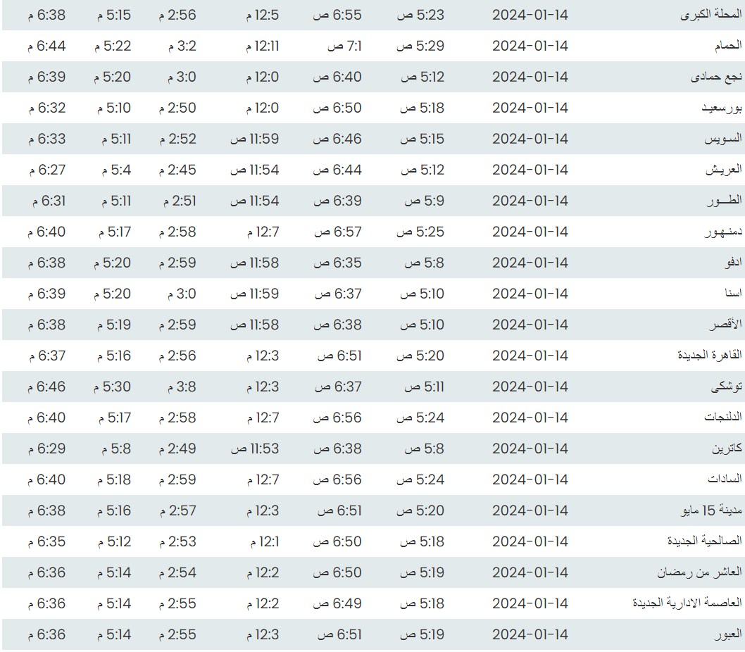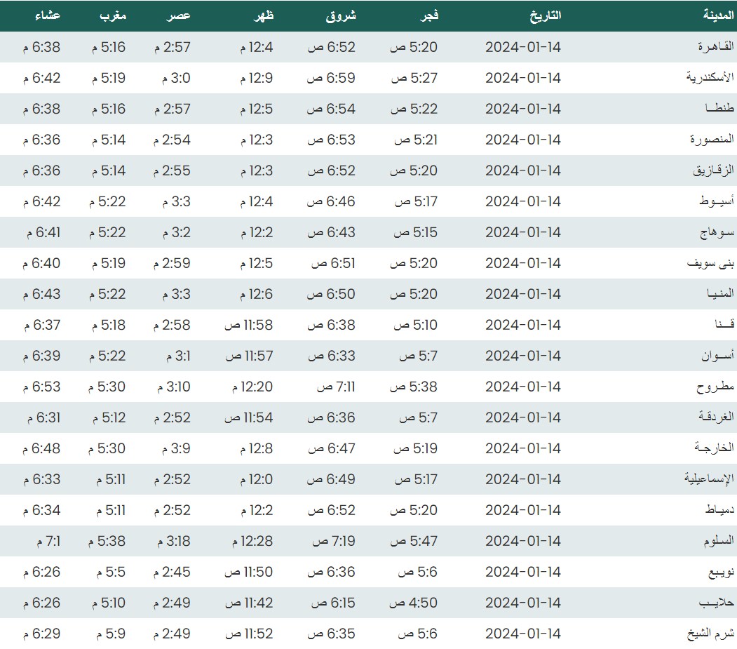وفيما يلي مواقيت الصلاة، لعدد من مدن ومحافظات الجمهورية من واقع بيانات الهيئة العامة للمساحة