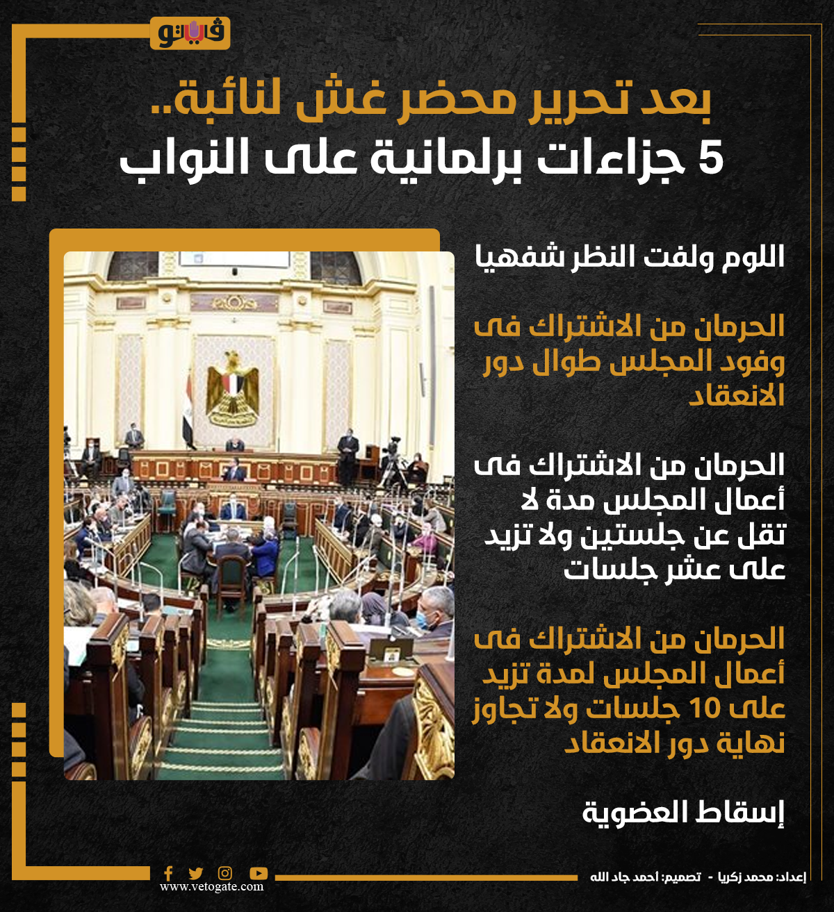 بعد تحرير محضر غش لنائبة.. 5 جزاءات برلمانية على النواب (إنفوجراف) الثلاثاء 09/يناير/2024 - 02:32 م 1/9/2024 2:32:06 PM مجلس النواب، فيتو محمد زكريا شارك طباعة 18 حجم الخط شارك طباعة اسقاط العضوية دور الانعقاد انفوجراف مجلس النواب البرلمان تحرير محضر