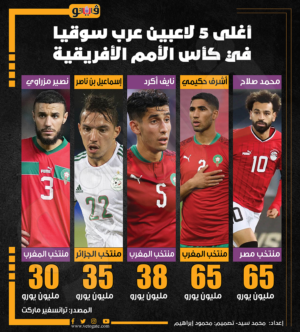 أغلى 5 لاعبين عرب سوقيا في كأس الأمم الأفريقية (إنفوجراف) الخميس 11/يناير/2024 - 02:00 م 1/11/2024 2:00:50 PM محمد صلاح، فيتو محمد سيد شارك طباعة 18 حجم الخط شارك طباعة كأس أمم أفريقيا أمم إفريقيا محمد صلاح أشرف حكيمي نايف أكرد إسماعيل بن ناصر نصير مزراوي