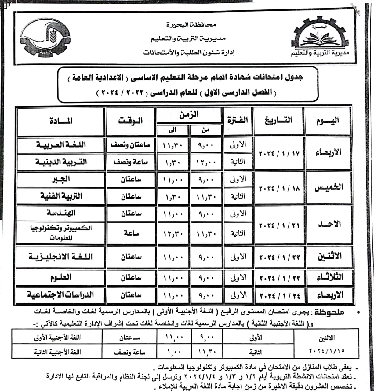 ننشر جدول مواعيد امتحانات الشهادة الإعدادية بالبحيرة