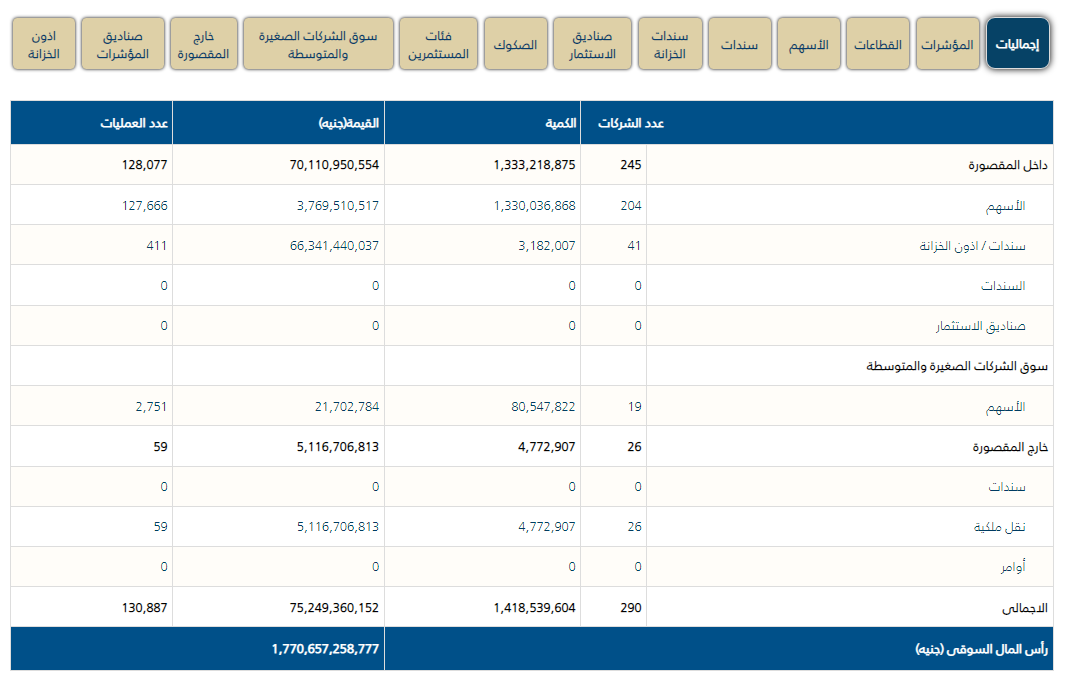 تباينت مؤشرات البورصة بختام تعاملات الأربعاء، وخسر رأس المال السوقي مليار جنيه ليغلق عند مستوى 1.752 تريليون جنيه.