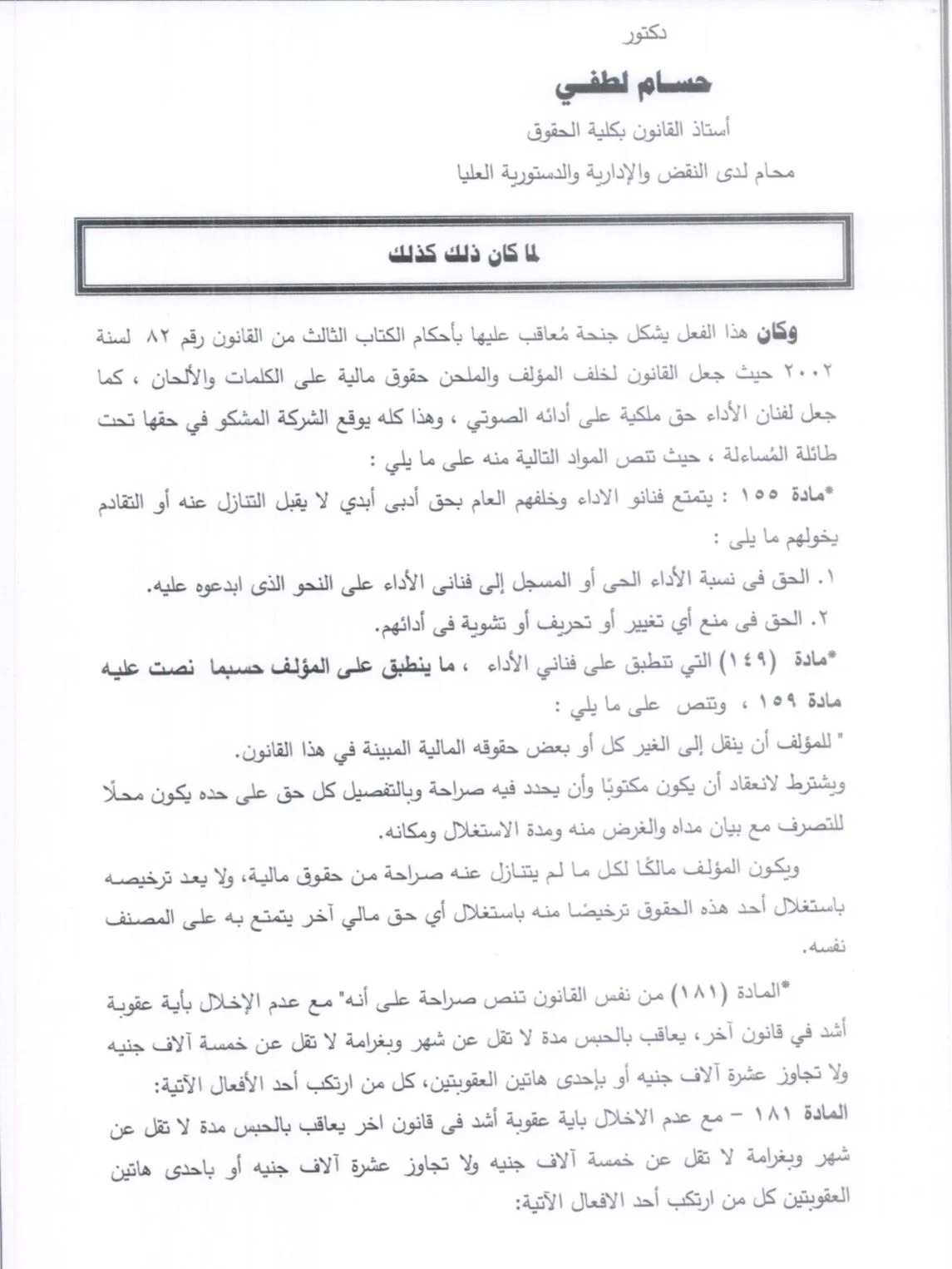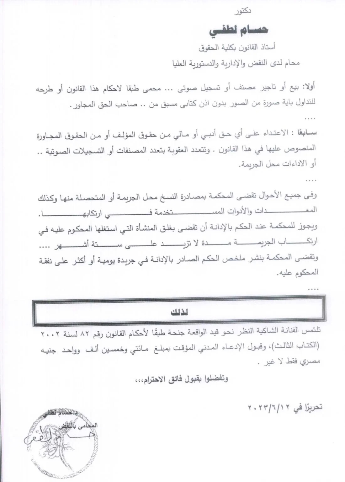 تقدم الدكتور حسام لطفي المستشار القانوني للفنانة شيرين ببلاغ ضد إحدى الشركات الخاصة بالإنتاج الفني يتهمها فيه بالتعدي على حقوق الملكية، بأنها وحدها تسيطر على قناة على تطبيق يوتيوب وتتيح عليها أغانيها كلها، ومنها أغان مملوكة لشركات أخرى بموجب عقود موقعة في شأنها.