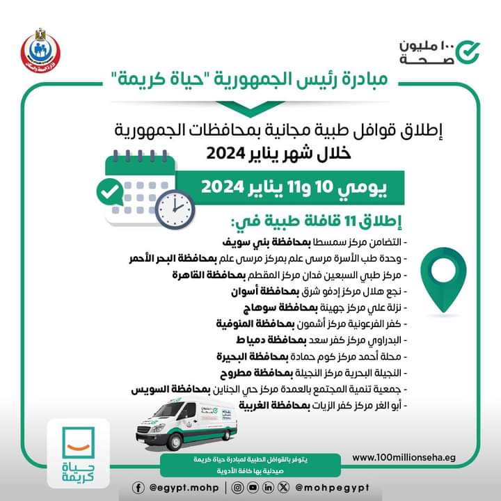 أعلنت وزارة الصحة عن إطلاق ١١ قافلة طبية ضمن مبادرة رئيس الجمهورية حياة كريمة يومي ١٠ و١١ يناير ٢٠٢٤ للكشف والعلاج مجانًا في التخصصات الطبية "نساء وولادة - خدمات تنظيم الأسرة - الأطفال والباطنة - الأنف والأذن والعظام - الجراحة - الرمد الأسنان - القلب - الجلدية وخدمات الأشعة والتحاليل.