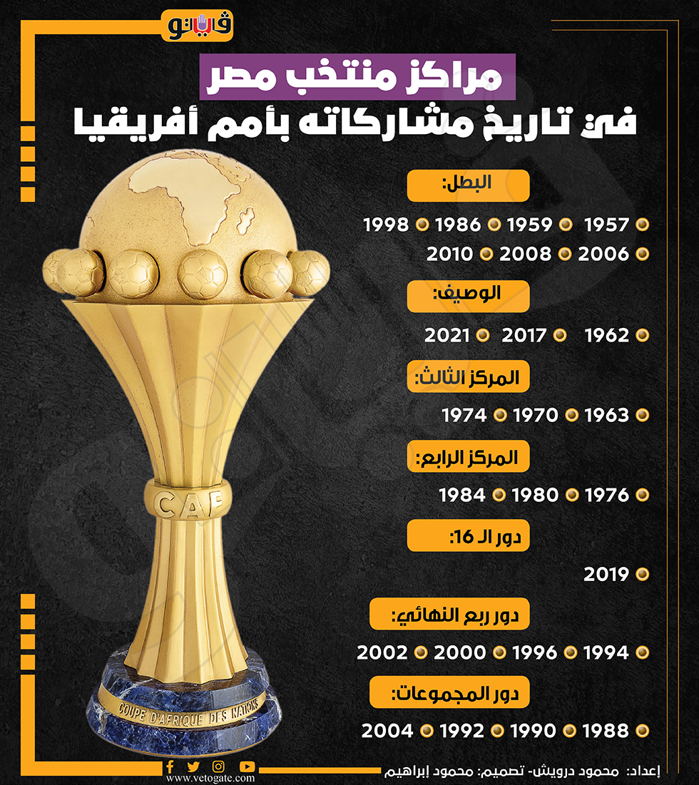 مراكز منتخب مصر في تاريخ مشاركاته بأمم أفريقيا (إنفوجراف) الخميس 11/يناير/2024 - 03:27 م 1/11/2024 3:27:09 PM كأس أمم أفريقيا، فيتو محمود درويش شارك طباعة 18 حجم الخط شارك طباعة منتخب مصر كأس أمم أفريقيا كاس الأمم الإفريقية كأس الأمم الإفريقية 2023 منتخب مصر الاول الفراعنة