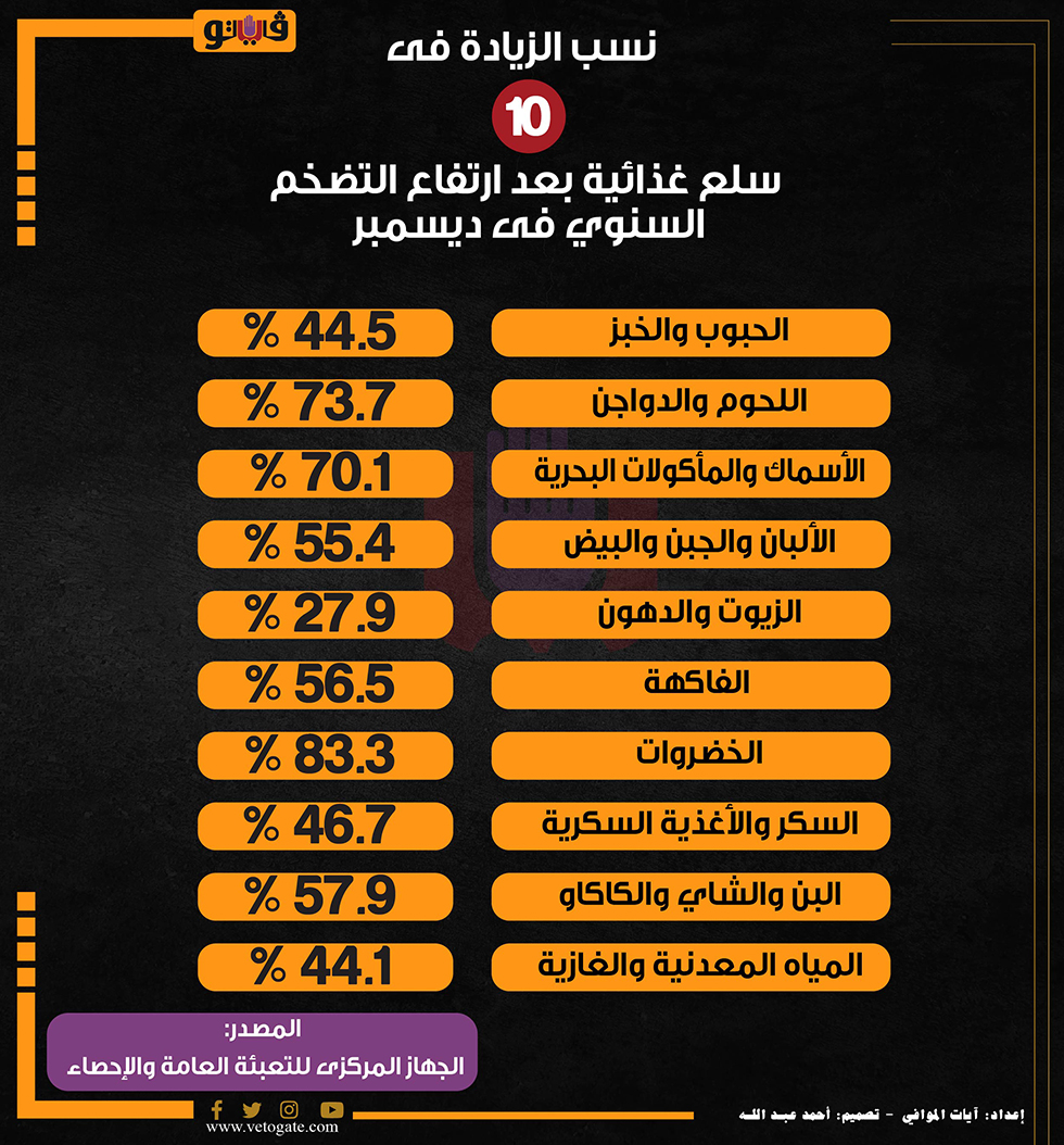 نسب الزيادة فى 10 سلع غذائية بعد ارتفاع التضخم السنوي فى ديسمبر (إنفوجراف) الأربعاء 10/يناير/2024 - 04:40 م 1/10/2024 4:40:55 PM الجهاز المركزى للتعبئة العامة والاحصاء،فيتو آيات الموافى شارك طباعة 18 حجم الخط شارك طباعة الحبوب اللحوم والدواجن الأسماك والمأكولات البحرية