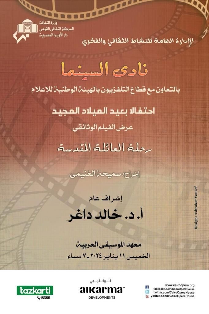 تتواصل فعاليات وزارة الثقافة للاحتفال بعيد الميلاد المجيد، حيث تعرض دار الأوبرا المصرية برئاسة الدكتور خالد داغر، الفيلم الوثائقي الطويل “رحلة العائلة المقدسة” من إخراج سميحة الغنيمي.