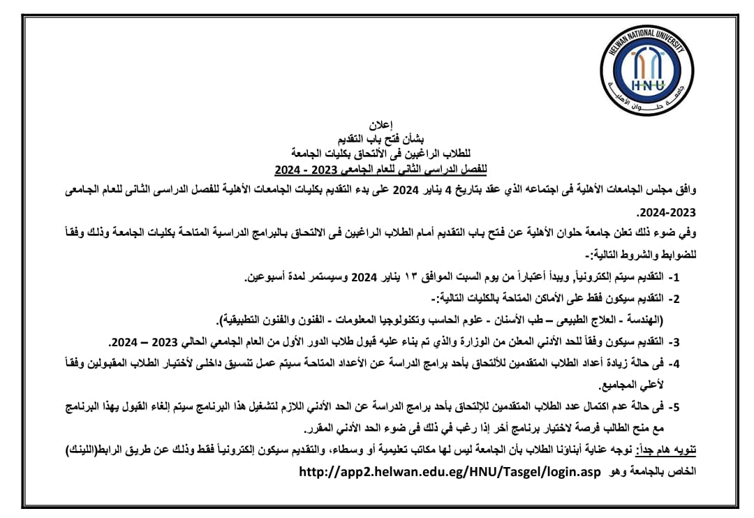 أعلنت جامعة حلوان الأهلية برئاسة الدكتور السيد قنديل رئيس الجامعة، عن فتح باب التقديم أمام الطلاب الراغبين في الالتحاق بالبرامج الدراسية المتاحة بكليات الجامعة للفصل الدراسي الثاني من العام الجامعي 2023-2024.