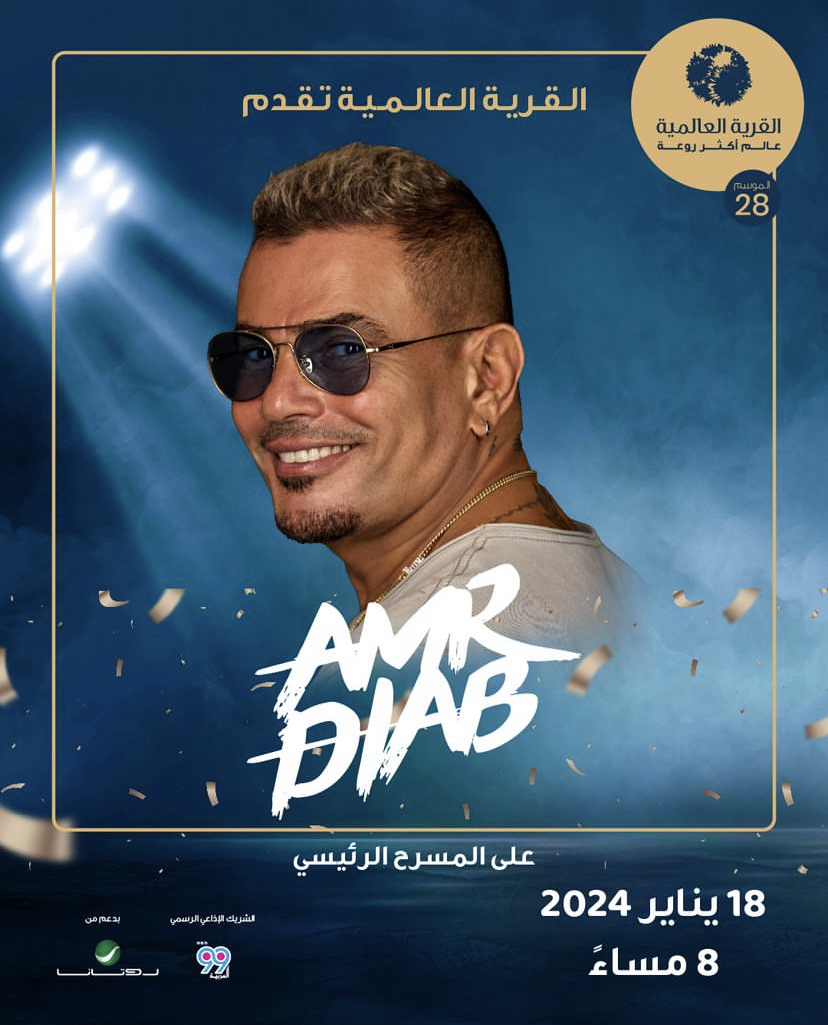 يحيي النجم عمرو دياب حفلا غنائيا ضخما مساء يوم الخميس الموافق 18 يناير الجاري، على المسرح الرئيسي بالقرية العالمية في دبي بدولة الإمارات العربية المتحدة، ضمن برنامج حفلات الهضبة خلال شهر يناير الجاري تزامنا مع بداية العام الجديد 2024.