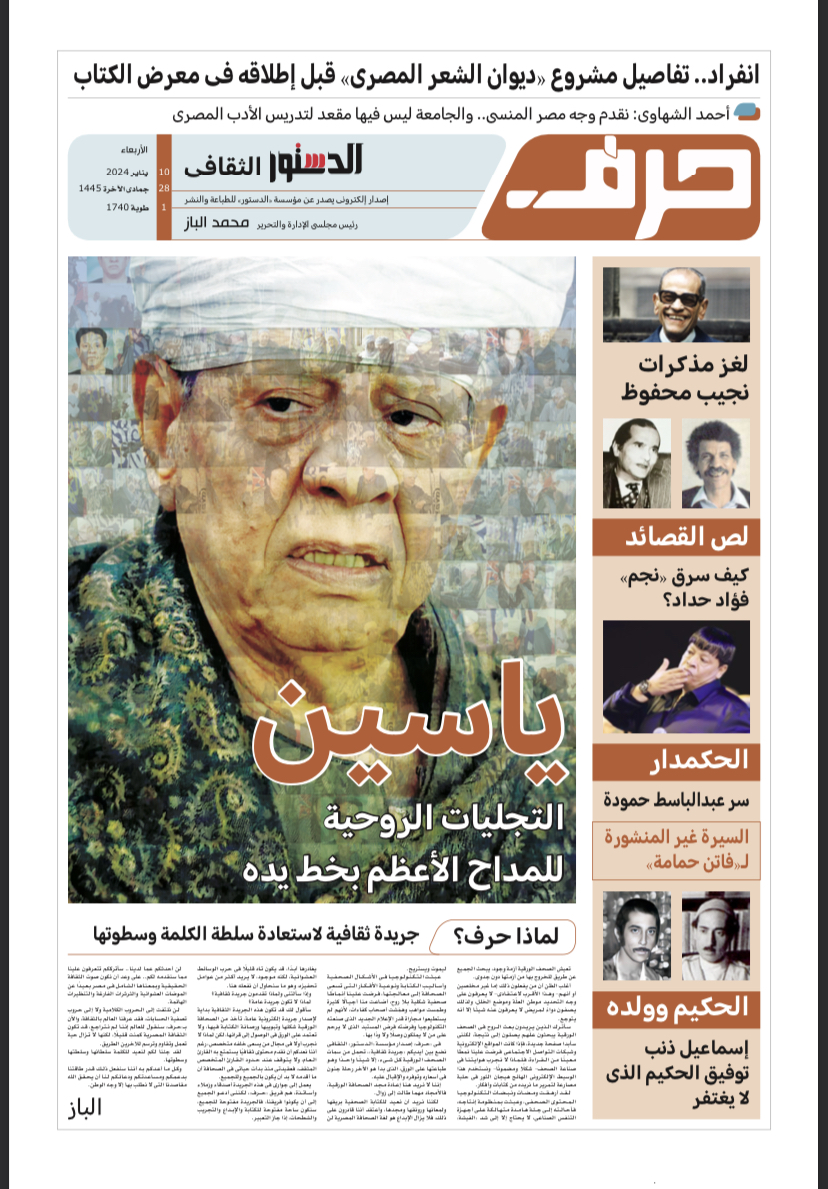 صدر مؤخرا العدد الثقافي الإلكتروني لجريدة الدستور برئاسة تحرير الكاتب الصحفي والإعلامي محمد الباز، وذلك في شهر يناير 2024 تحت عنوان "حرف".